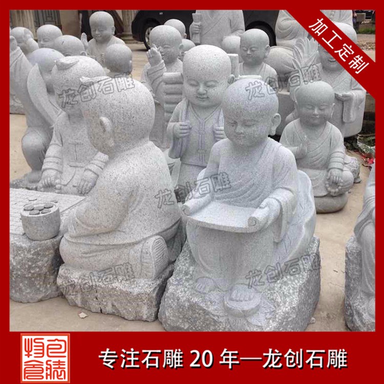 石雕小和尚就是用石頭雕刻制作的小和尚造型,一般都是7歲以上,20歲以下的孩童雕塑。由于小孩的天真爛漫,各種各樣有趣的造型都會(huì)做出來,比如下棋的小沙彌,睡姿的小沙彌、嬉戲的以及功夫小沙彌,打掃衛(wèi)生的等等,也有一些修行的小沙彌造型,比如參禪打坐的造型,敲木魚的造型。石雕小和尚的百態(tài)千姿是寺廟諸佛菩薩雕塑里面較多的一種,也是讓信眾們發(fā)自內(nèi)心的喜愛和尊敬的一種佛教弟子塑像。